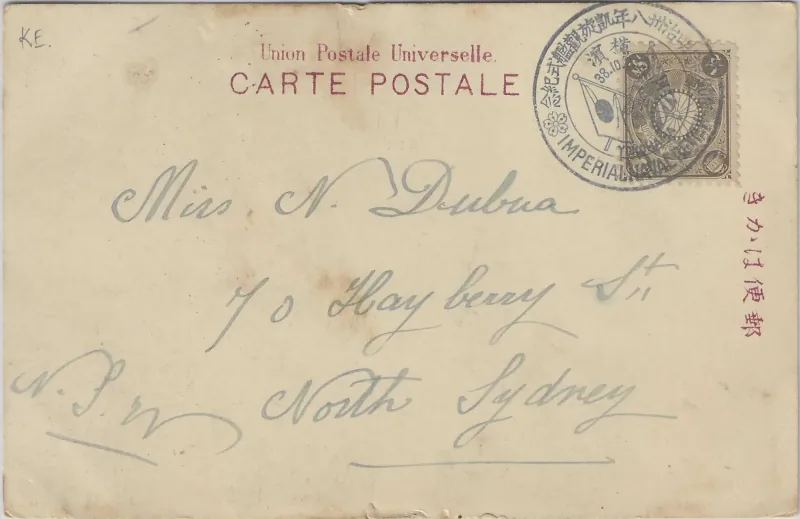 Imperial Postal Service, Japan 1906, tied with ½d NSW stamp