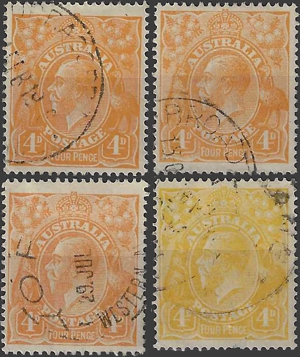 King George V, Australia 1915 – 17, 4d, 3x Orange Shades & Yellow-Orange