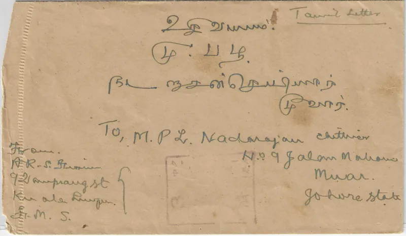 Letter enclosed, Addressed and Stamped “Tamil Letter on Front”