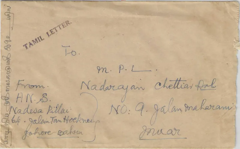 Letter enclosed, Addressed and Stamped “Tamil Letter on Front”