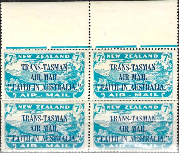 “Trans-Tasman Air Mail ‘Faith in Australia'” overprint Block of 4